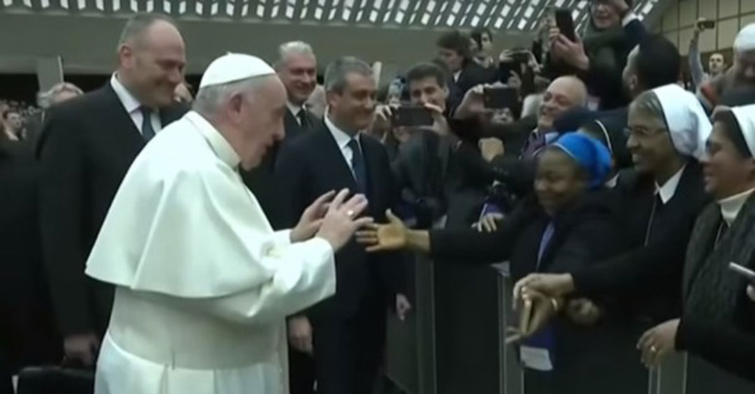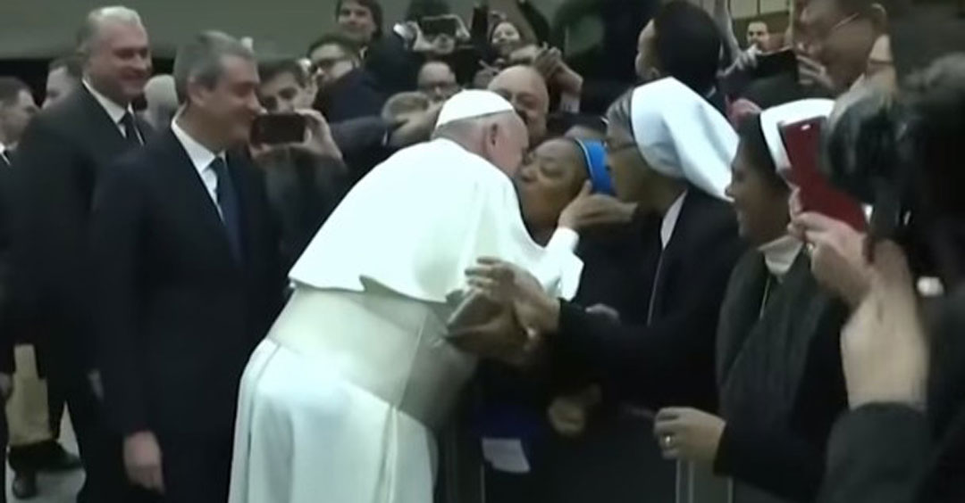 83岁的教宗当时走过一个大厅,准备进行每周接见活动,一位修女要求教宗给她一个亲吻。教宗打趣地回应道:“你会咬人的!”但接着就说:“我会吻你,但你要冷静,不要咬我!”修女点头答应后,教宗就弯身吻了她的面颊一下,修女一脸雀跃,旁边的人也欢呼起来。教宗之后就与其他信众握手。