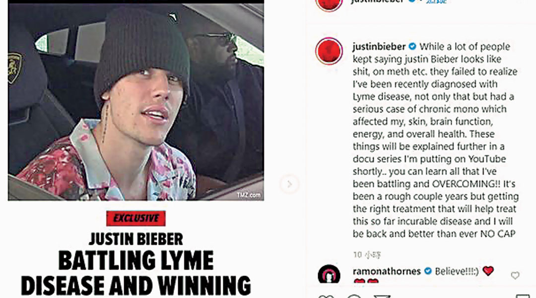 25岁加拿大偶像“小贾斯汀”贾斯汀比伯 (Justin Bieber)今在IG表示:“最近很多人一直说贾斯汀看起来像嗑药,他们不知道我被诊断出罹患莱姆病(Lyme Disease)。”