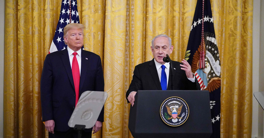 特朗普(左)偕内坦亚胡(右)公布中东和平方案。(法新社照片)
