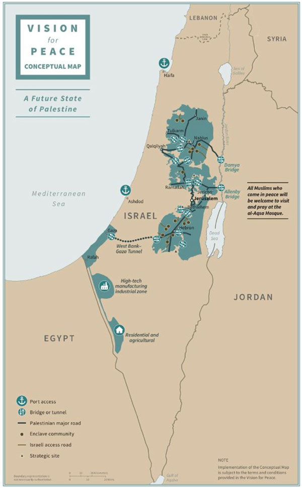 其后特朗普在推特发布一张未来的以巴构想图,以蓝色标记的巴勒斯坦国将继续由西岸及加萨地带组成,两地以公路及地下隧道连接。特朗普在白宫表示:“我的视野为双方提供双赢的机会,是一个现实的两国方案,解决了巴勒斯坦立国对以色列安全的风险。”内坦亚胡形容这是“历史性的一天”,他同意以色列会按照方案与巴方启动和平谈判。
